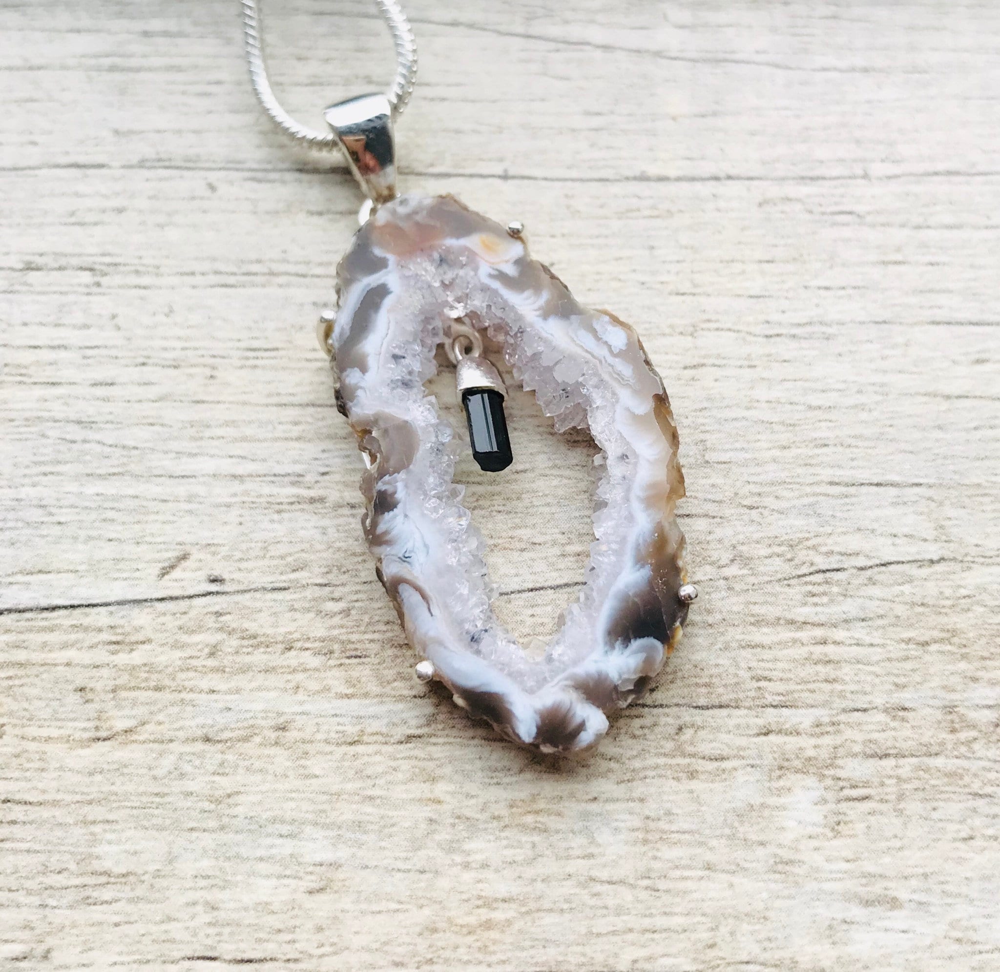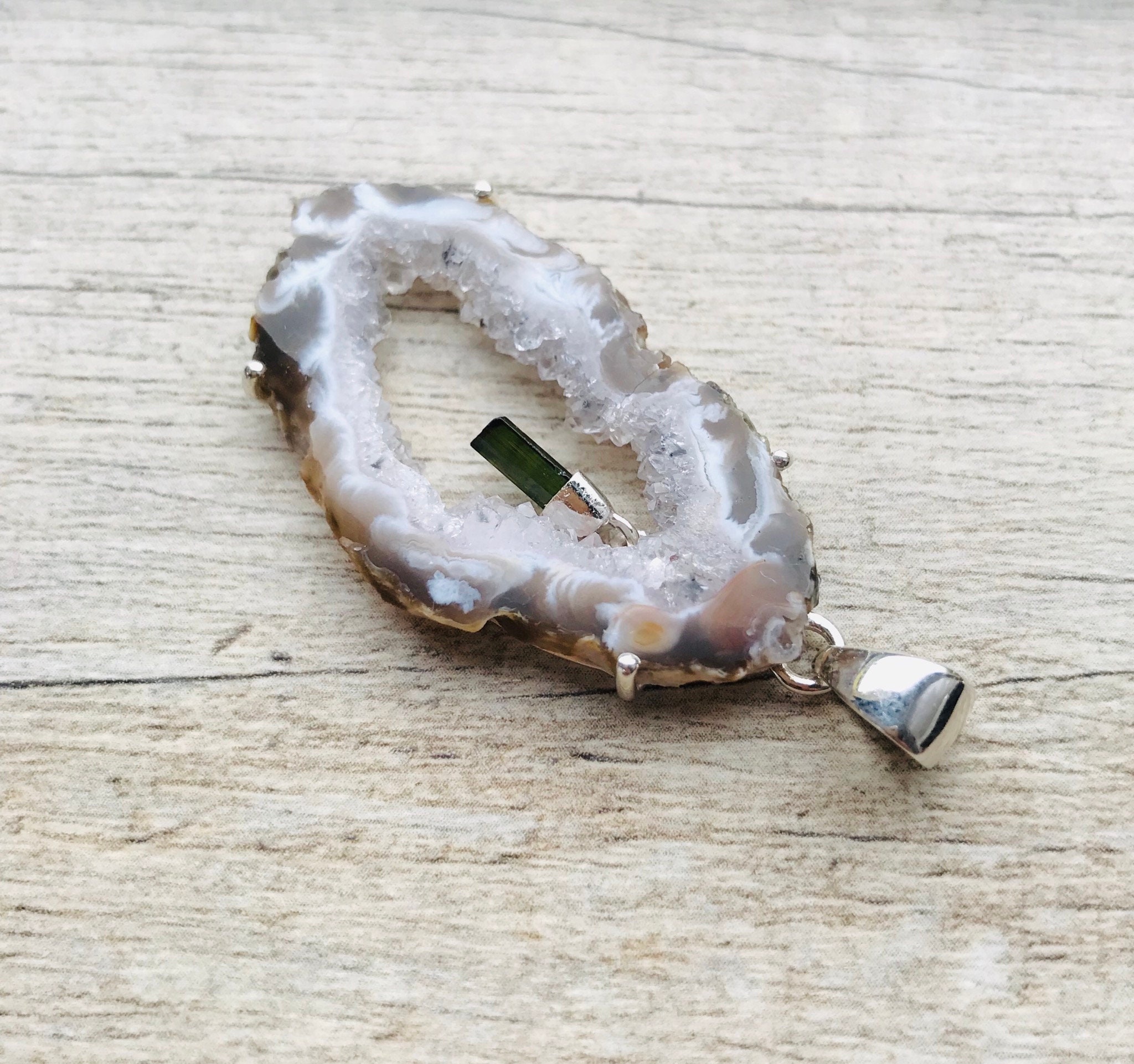Natural Raw Druzy Agate Geode and Green Tourmaline Sterling Silver Pendant/Necklace
