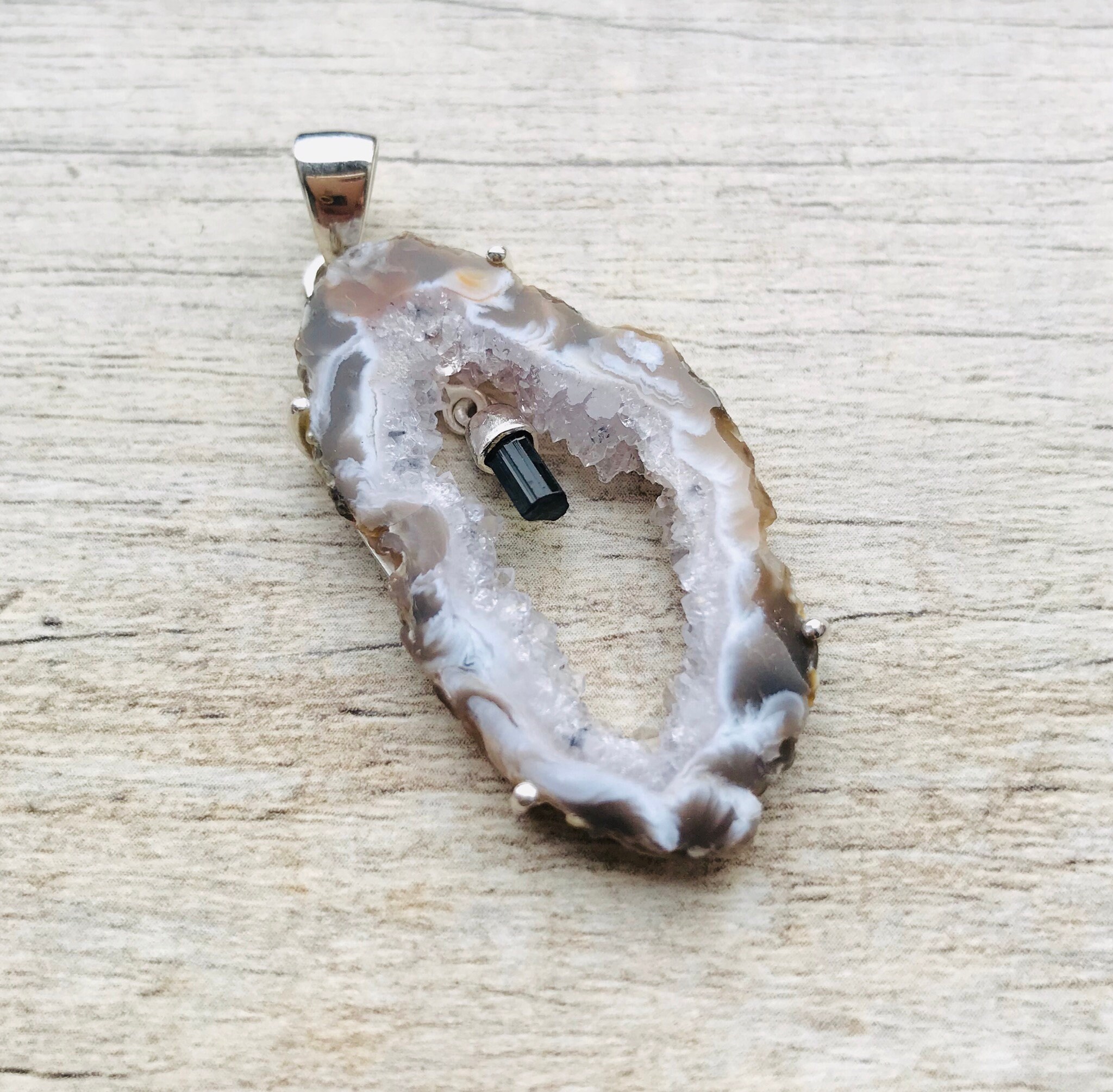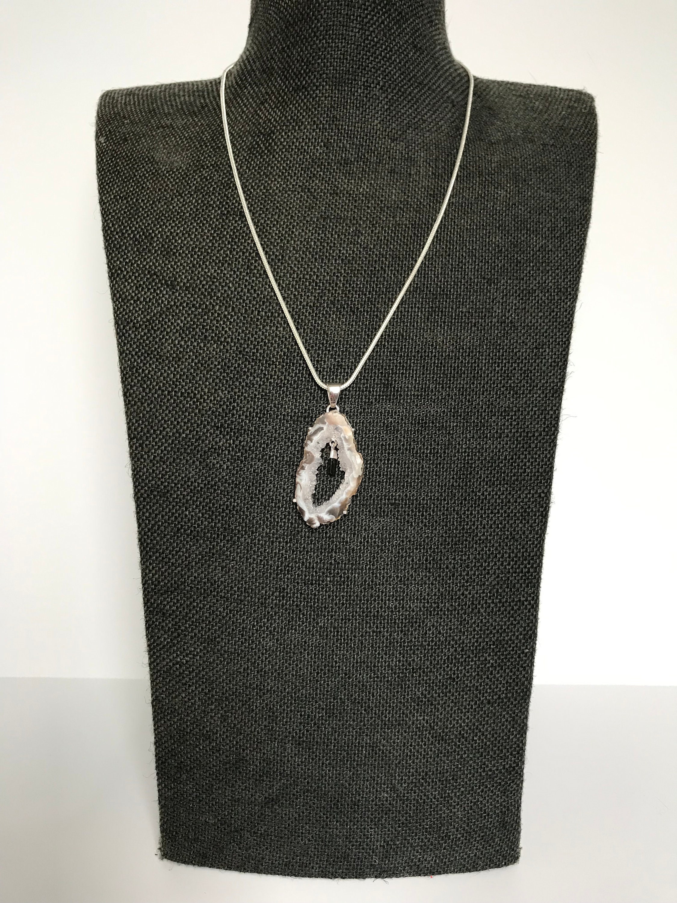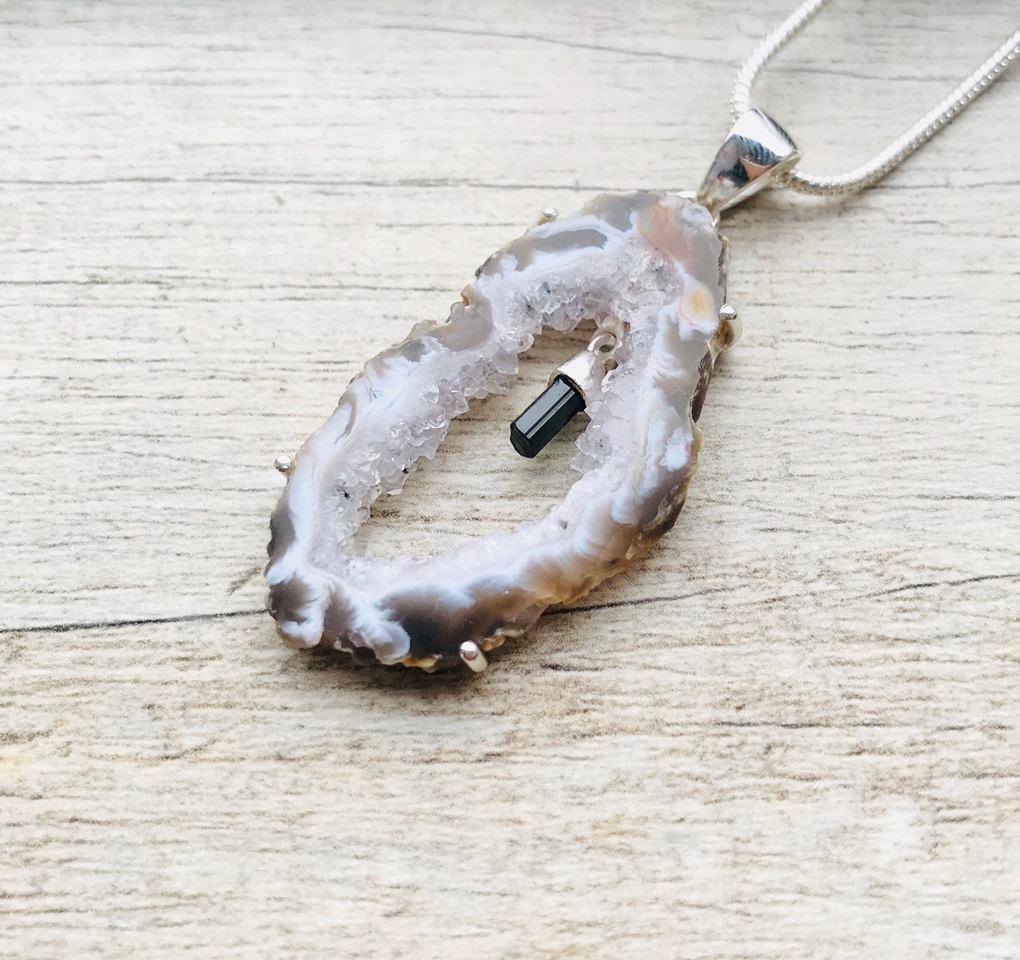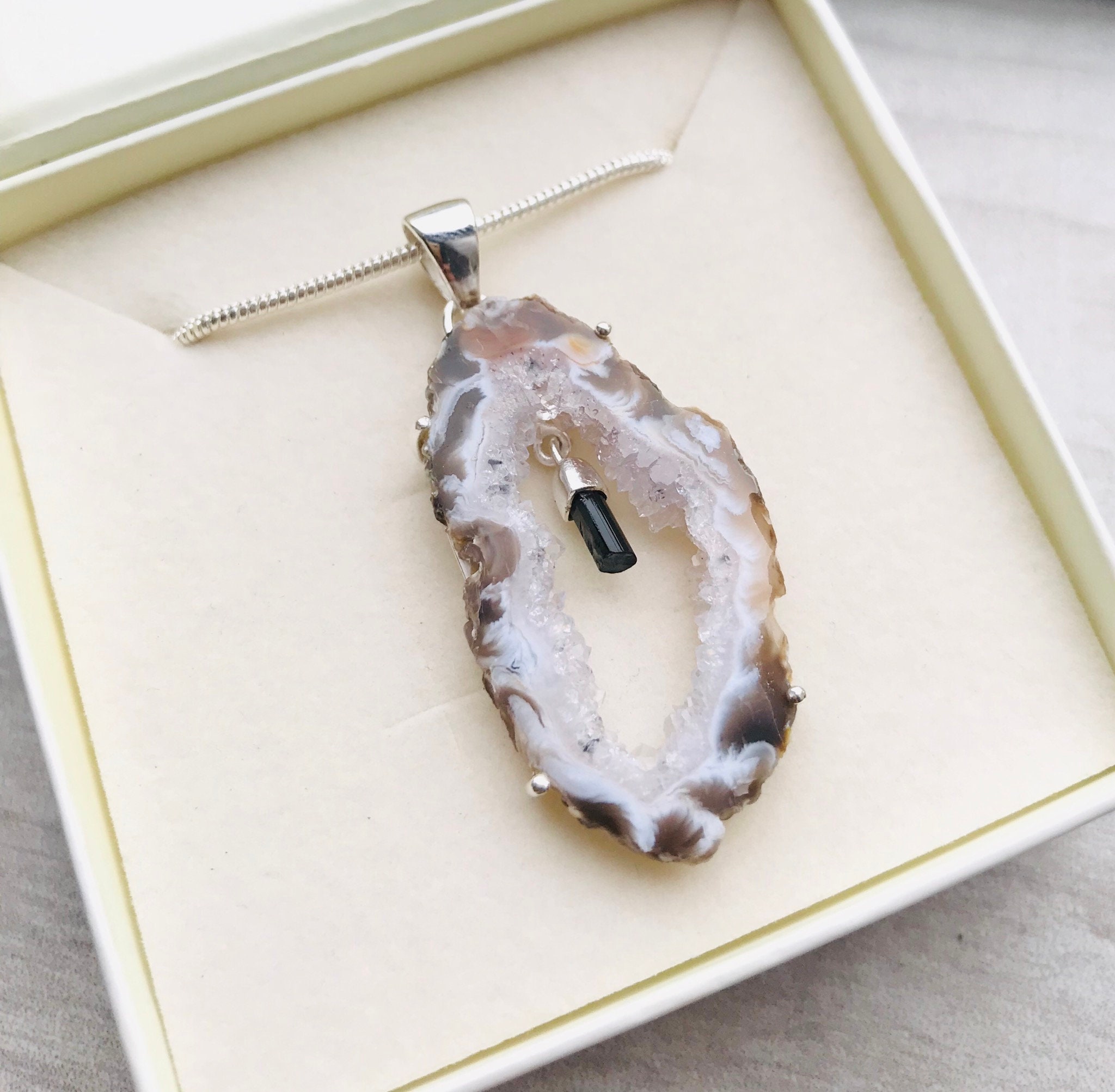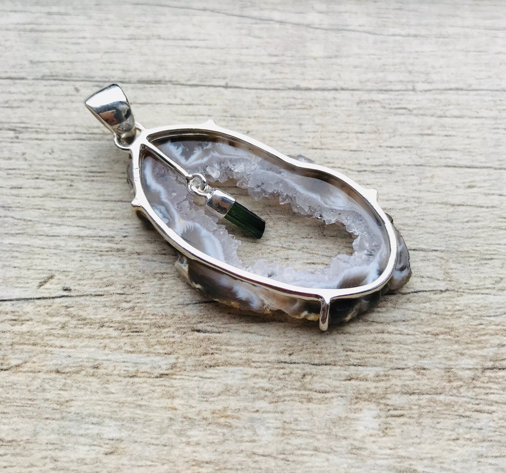 Made with high quality genuine natural raw druzy Agate slice (40mm x 20mm) and small raw Green Tourmaline crystal in genuine 925 Sterling Silver stamped. Total length of the pendant is approximately 2 inches (50mm).