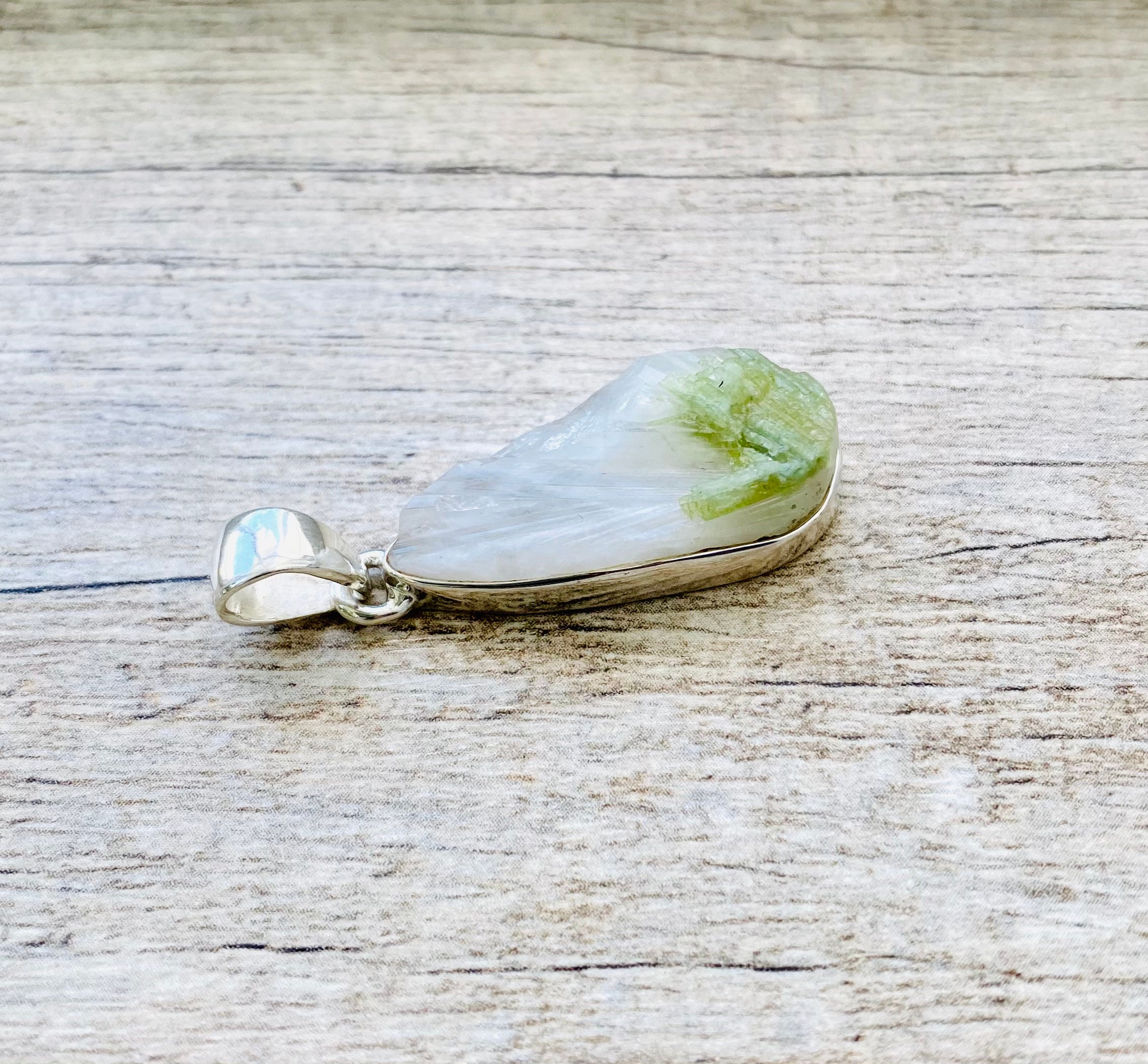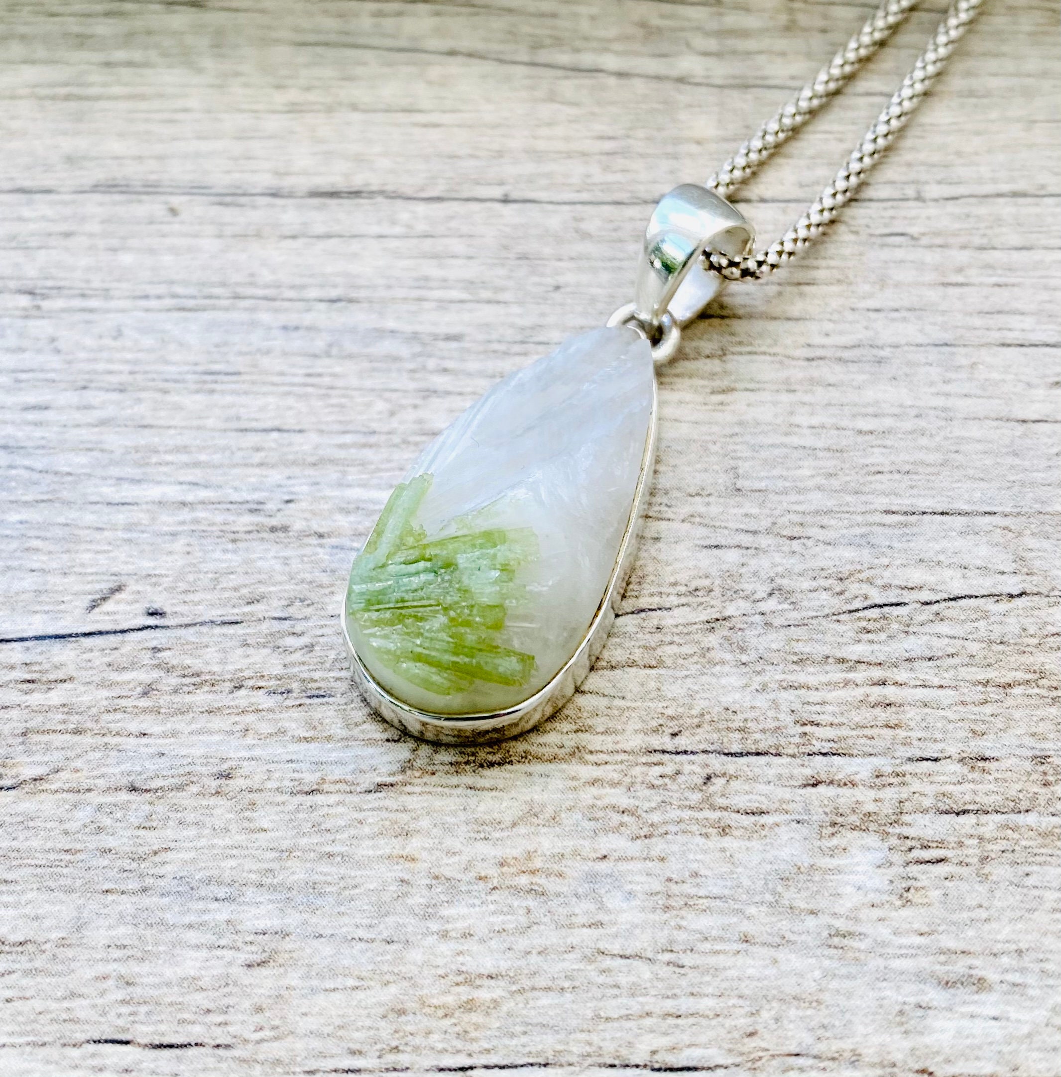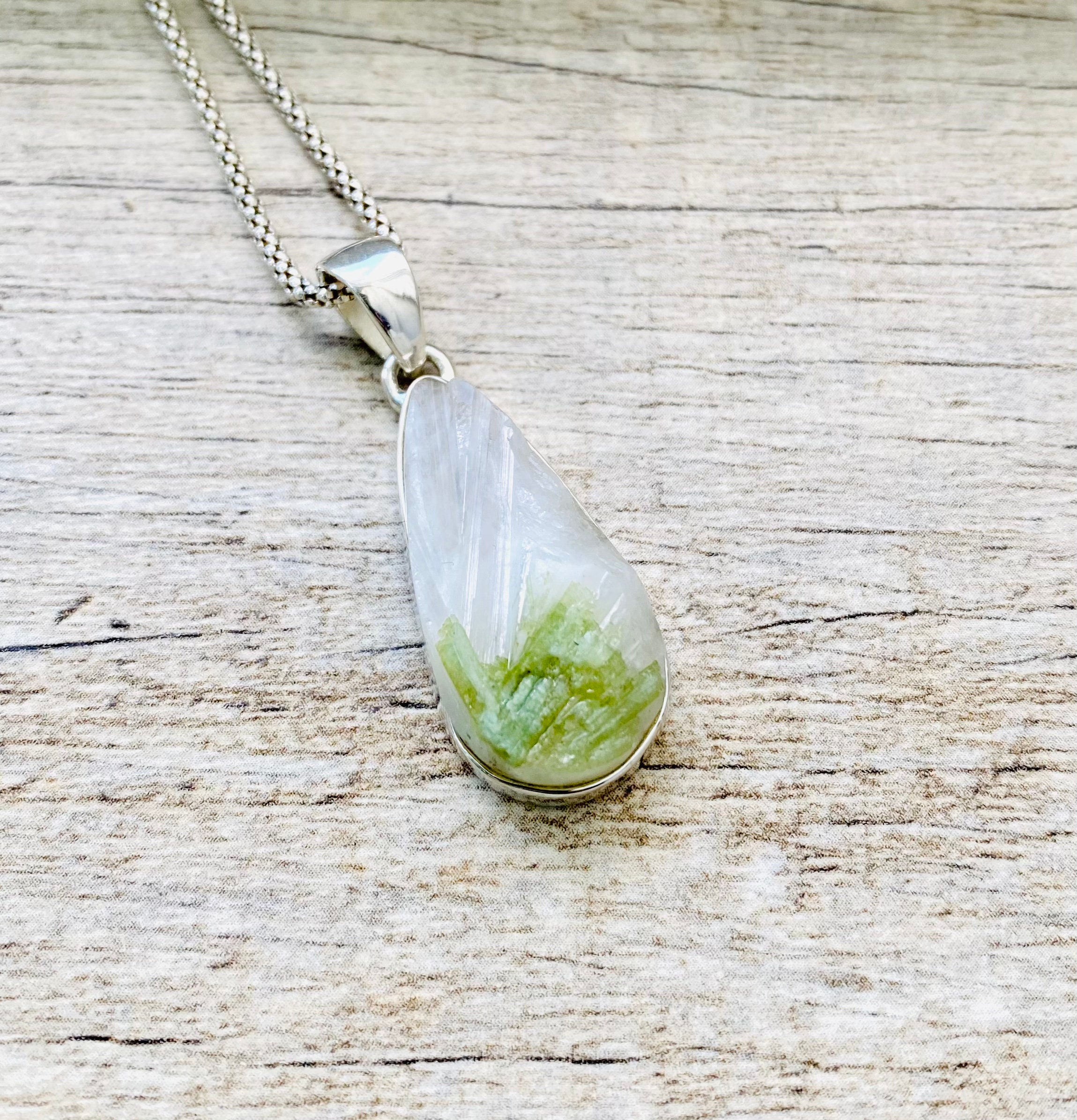 Made with high quality genuine natural raw Green Tourmaline in Quartz (28mm x 15mm) in genuine 925 Sterling Silver stamped. Total length of the pendant is 1.5 inches (40mm).